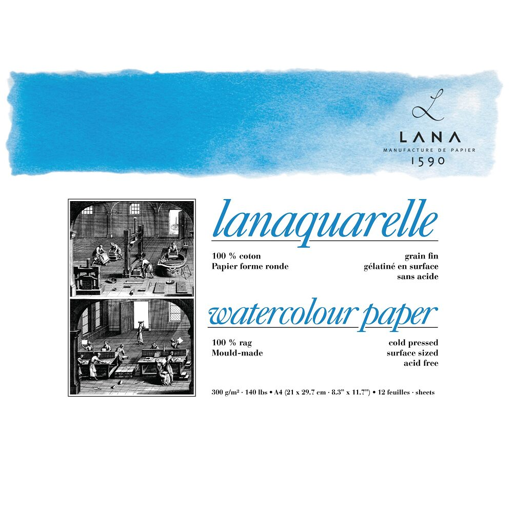 • Lanaquarelle is made on a cylinder mould machine, giving it the look and feel of a handmade paper, but with better consistency. Lanaquarelle papers are 100% cotton, neutral pH, 140 lb (300 gsm).